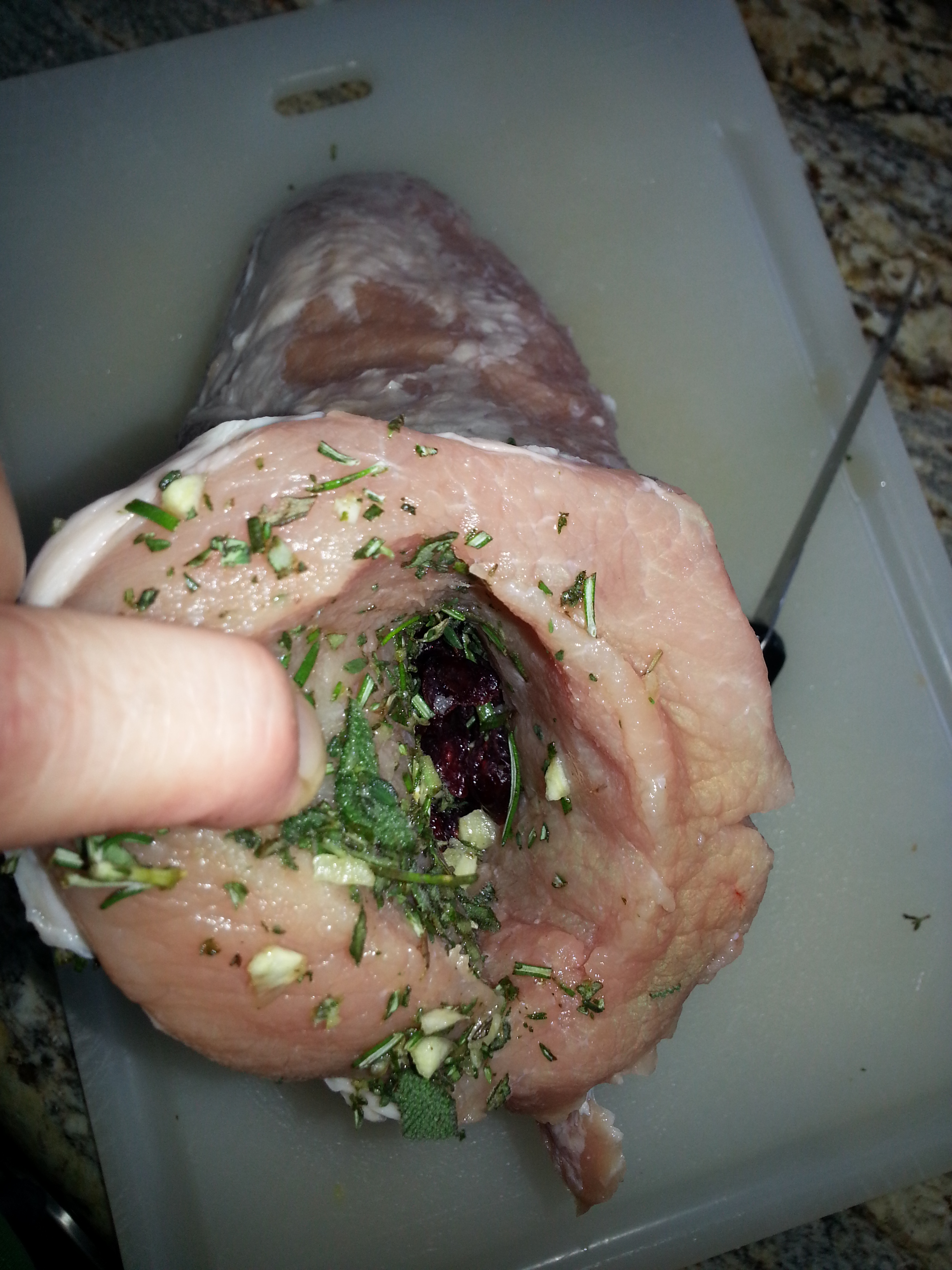 Place cranberries and Marsala together in a bowl, set aside. Using a food processor add Sage, Rosemary, Thyme, Garlic and “pulse” herbs for 20 seconds. With a long sharpened “chef’s knife”, insert into the wide end of the pork roast and begin to make a pocket slit for the length of the pork without the knife coming out of the meat. Reserve Marsala in a separate dish, combine soaked cranberries and herbs together, then begin to fill the inside of pork pocket slit until about 3/4 the way full, pushing down with end of wooden spoon in order to optimize the filling. Rub salt onto entire roast. Layer with herbs and bacon, optional. Place into baking dish; may tie off pork roast with a single string encircling the meat from end to end to close pork roast and tie with a knot, or tie the entire roast with the twine.