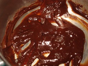 On medium-low heat place a sauce pan and 4 chocolate squares (50 g). With a rubber spatula or wooden spoon begin to stir chocolate until melted. Add sugar and stir. Remove sauce pan from heat. To reduce coagulation of chocolate and to achieve a creamier fluid, begin to slowly work in milk, add only 1 TABLESPOON MILK and stir for 10 seconds, add a ANOTHER TABLESPOON MILK, stir for 10 seconds, add 1/4 cup stir thoroughly.